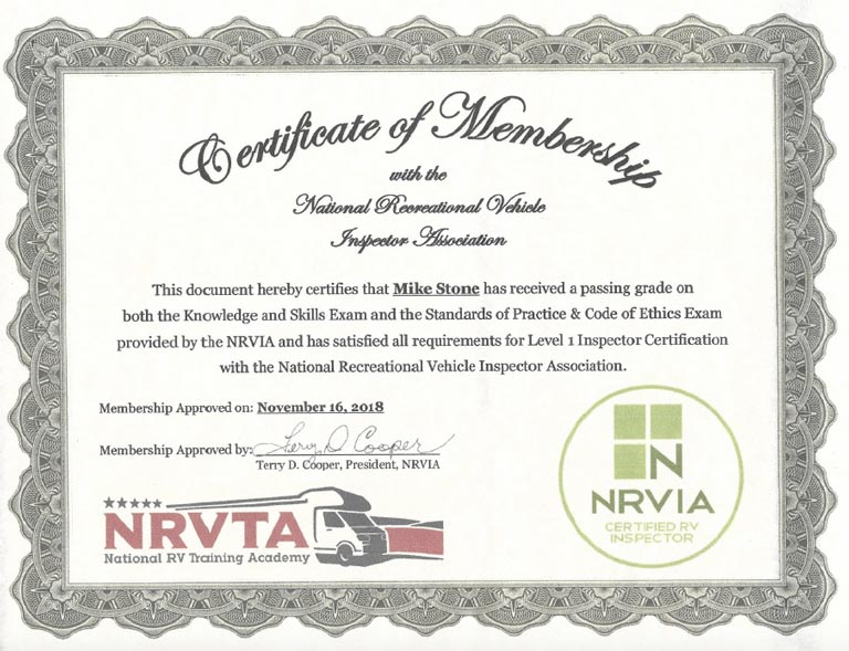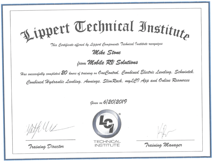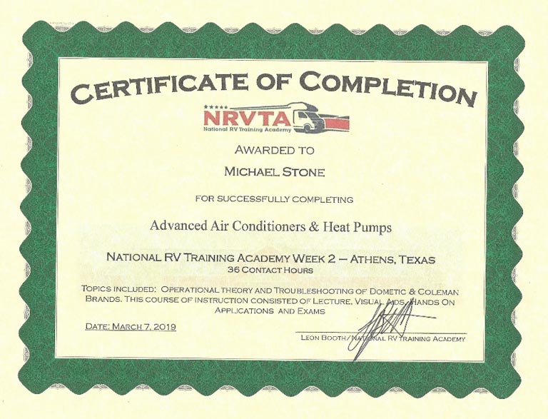 Mobile RV Solutions lead RV Technician, Mike Stone, is highly trained and certified in hydraulics. He has been trained and is certified by the National Recreational Vehicle Inspectors Association (NRVIA) and the National Fluid Power Association (NFPA) with over 30 years experience in design and hydraulic repair. Mike received additional training at the newly established National RV Training Academy (NRVTA) in Athens, Texas and stays current with the latest in RV models and equipment through annual refresher courses.